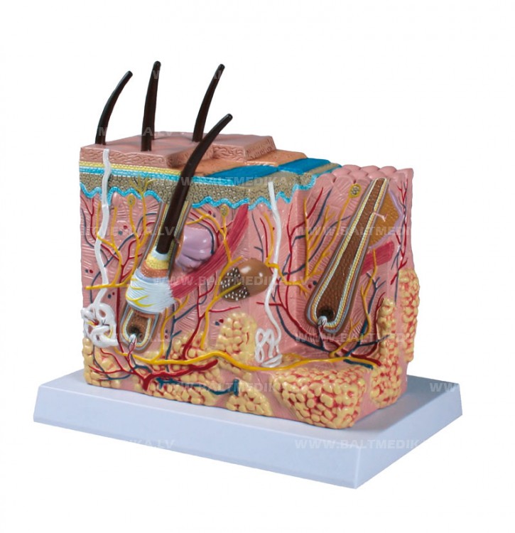 Šis cilvēka ādas uzbūves modelis, kas ir apmēram 50x palielināts, uzskatāmi parāda trīs dimensijās ādas slāņus un anatomiskās struktūras. Rūpīgi izstrādātas detaļas - nervi, asinsvadi, sviedru dziedzeri, tauku dziedzeri, mata folikuli, asinsķermenīši un daudz kas cits.