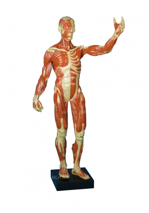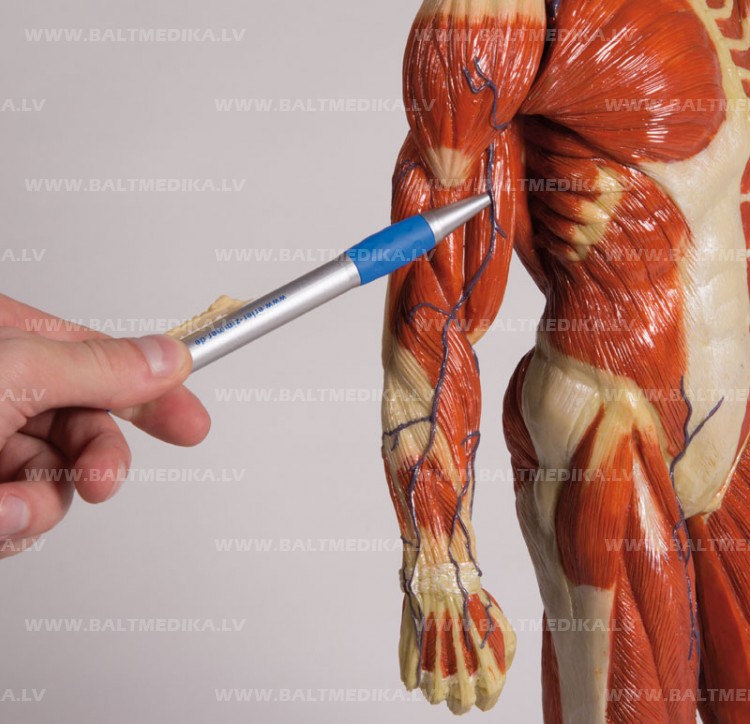 Šī muskuļu figūra ir ārkārtīgi smalkas struktūras un ļoti detalizēta. No vienas puses parādīti virspusējie muskuļi, no otras - dziļā muskulatūra. Abas rokas ir noņemamas. Perfekts līdzeklis studijām, pacientu izglītošanai kā arī fizioterapijai. Augstākā kvalitāte.