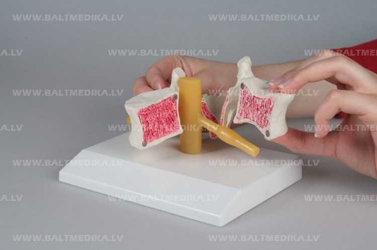 Šis cilvēka jostas skriemeļa modelis ir sadalīts vidū un parāda veselu kaulu struktūru vienā pusē un osteoporozes kaulu struktūru otrā pusē. Modelis ir samontēts magnētiski un to var viegli noņemt no stenda.