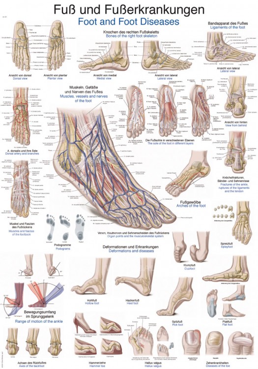 Augstas kvalitātes anatomiskā diagramma, kas izgatavota no plastmasas, ieskaitot metāla apšuvumus ar pakaramo auklu. Vācu un angļu valodā. Izmērs: 70x100cm Uzskates materiāls - Pēda un pēdas slimības (50x70cm)