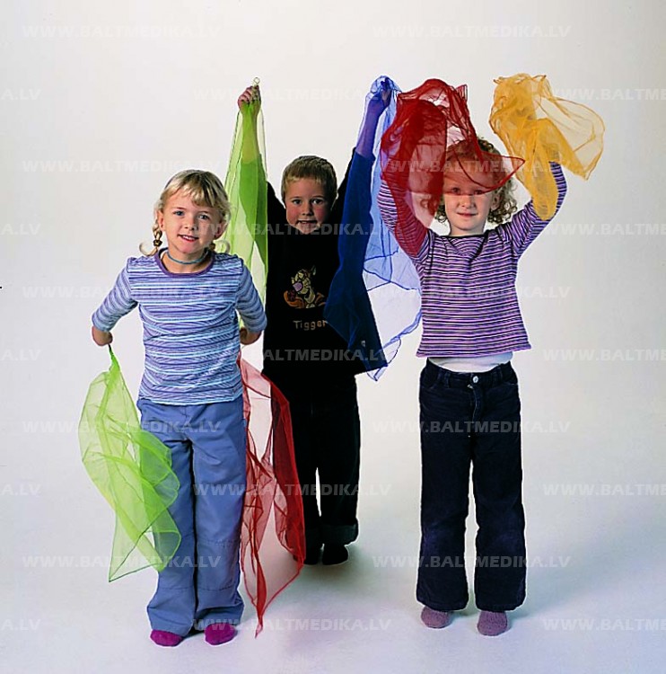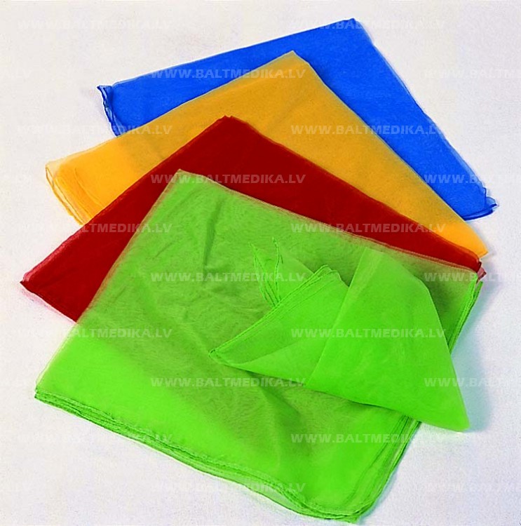 Komplektā 12 gaisīgi neilona lakatiņi jautrās krāsās (dzeltens, sarkans, zils un zaļš).