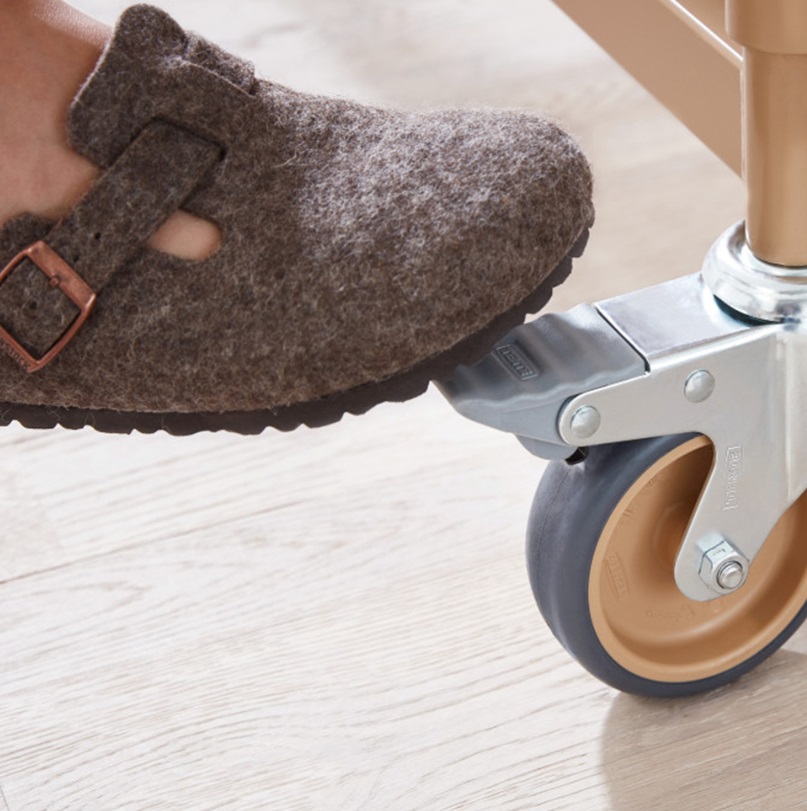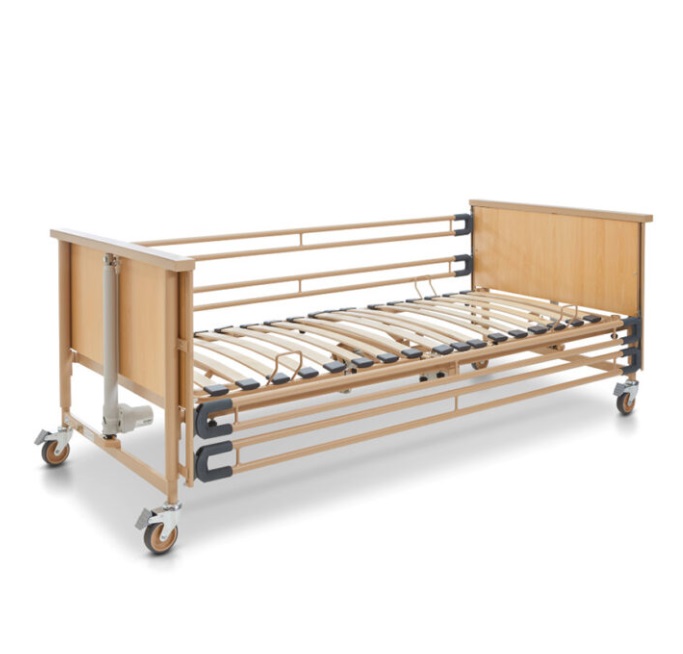 Maksimālā gultas noslodze – 185 kg. Tās rāmis izgatavots no krāsotiem metāla profiliem. Gulēšanai paredzētā virsma izgatavota no koka, to veido četras daļas, aprīkota ar matrača turētājiem. Gultas gali izgatavoti no laminētas koka skaidu plāksnes. Visas koka daļas – dižskabārža krāsā. Atjaunotos 10 cm diametra gultas ritenīšus ar individuālām bremzēm, kas garantē stabilu fiksāciju, var lietot ar vai bez uzvilktām čībām. Galvgalī atrodas speciālas kabatas, kur iespējams uzstādīt pacelšanās rokturi. Gultas komplektācijā ietilpst: nolaižamas koka sānu margas abās gultas pusēs un pacelšanās rokturis. Easy click sistēma – sānu margu pacelšana dažu sekunžu laikā garantēta!