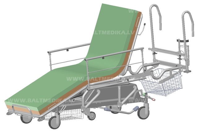 - Ar gāzes amortizatora palīdzību regulējami: muguras atbalsts, kāju daļa, Trendelenburga un Antitrendelenburga stāvokļi;