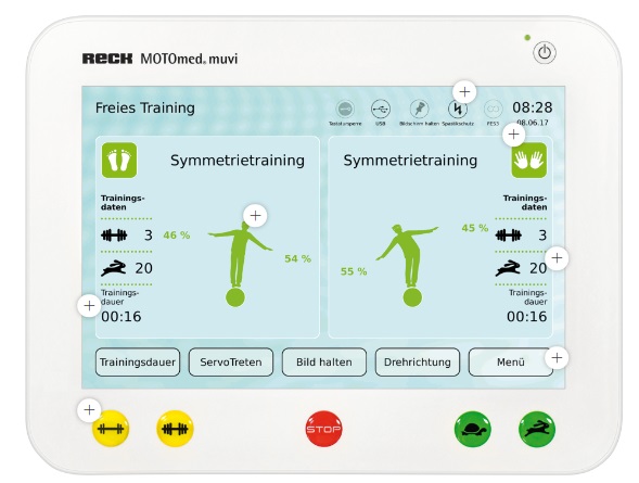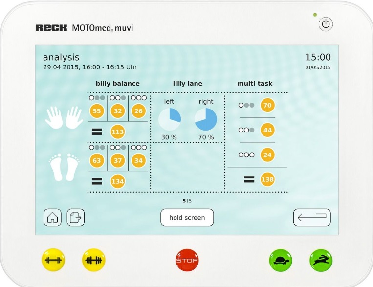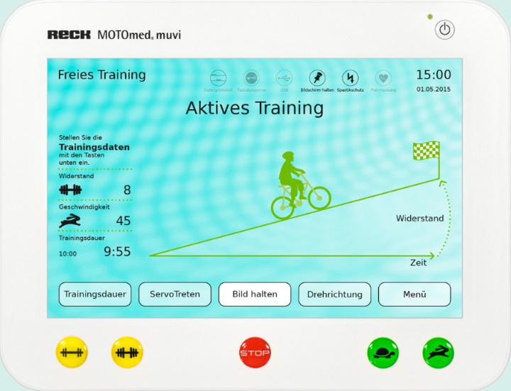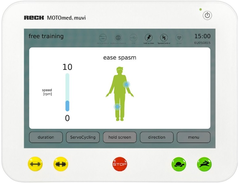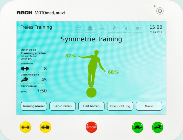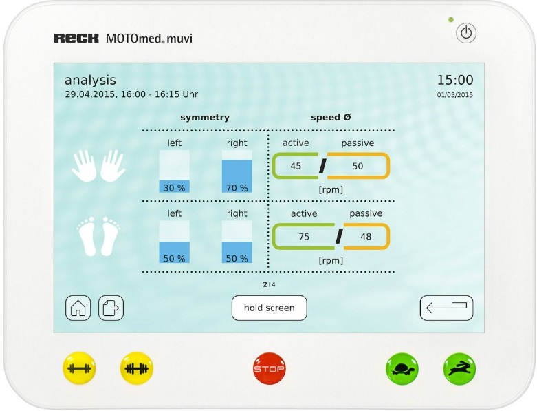 - Displejs: augstas izšķirtspējas, skārienjūtīgs krāsu displejs(12,1"/30,48 cm) . Viegli var regulēt. Visi MOTOmed modeļi sniedz lietotājam plašas atsauksmes par apmācības rezultātiem. Treniņa datus, piemēram, ilgumu, attālumu, simetriju, iztērēto enerģiju, tonusu, vidējo un maksimālo jaudas vērtību kW aktīvajā režīmā, apmācības ilguma attiecību aktīvā un pasīvā režīmā, lietotājs var nolasīt uz ekrāna reāllaikā vai formā vispārēja analīze pēc apmācības.