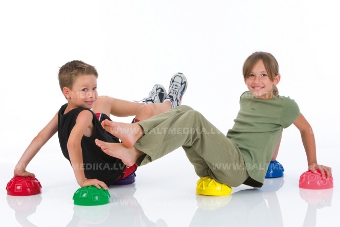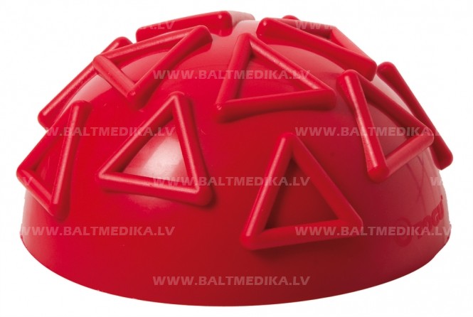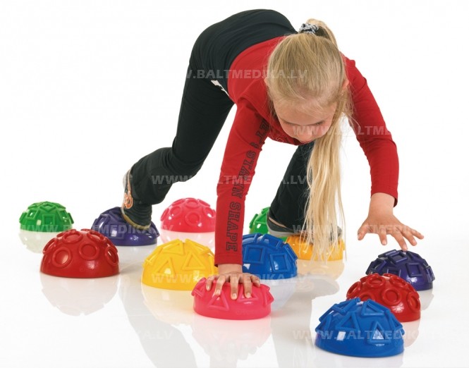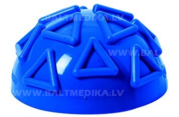 Ar gaisu pildīts, pusapļa formas līdzsvara spilvens, kas izgatavots Vācijā, ar dažādām ģeometriskām formām (aplis, taisnstūris, trīsstūris) uz virsmas.